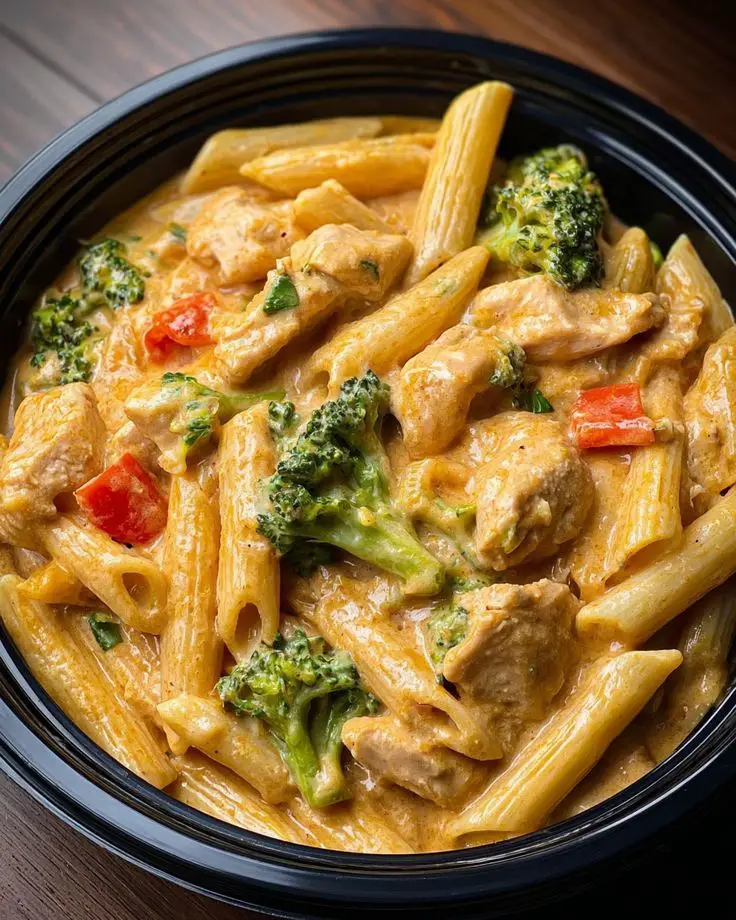 Pour in the chicken broth and heavy cream. Stir well and let it simmer for 3–5 minutes until slightly thickened.