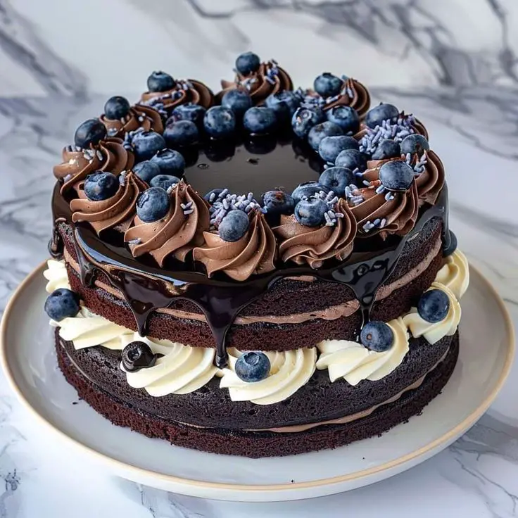Place one cake layer, spread chocolate frosting, then pipe vanilla frosting swirls around edges. Add some blueberries.