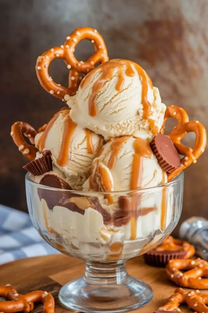 Break some pretzels and scatter them around the ice cream. Add mini peanut butter cups or chocolate pieces.