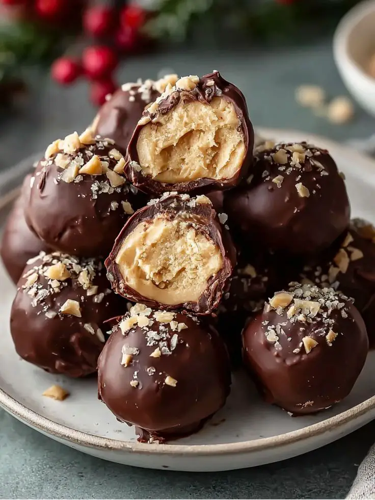 Once the chocolate and coconut oil are melted, remove the peanut butter balls from the refrigerator. One at a time, roll the balls in the melted chocolate, allowing the excess chocolate to drip off. Set the dipped balls back on the parchment paper and sprinkle with flaky salt. Cool for 10 minutes and enjoy.