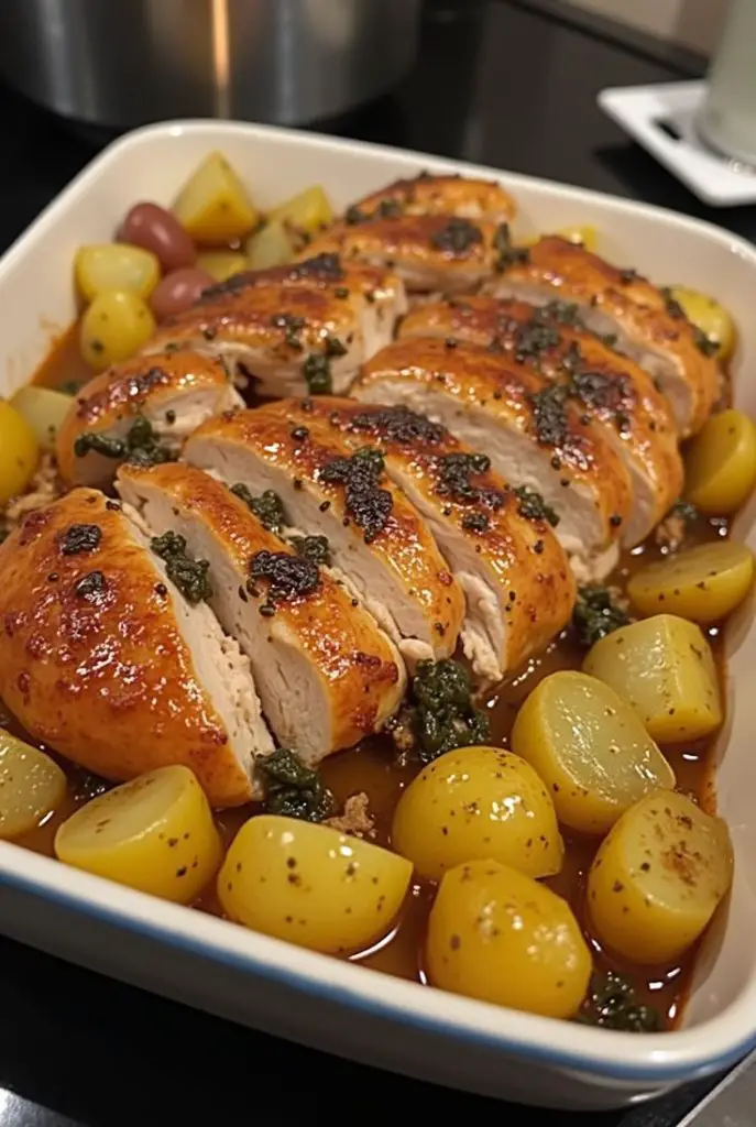 7. Remove foil and bake uncovered for another 20–25 minutes, until chicken is golden and potatoes are tender.