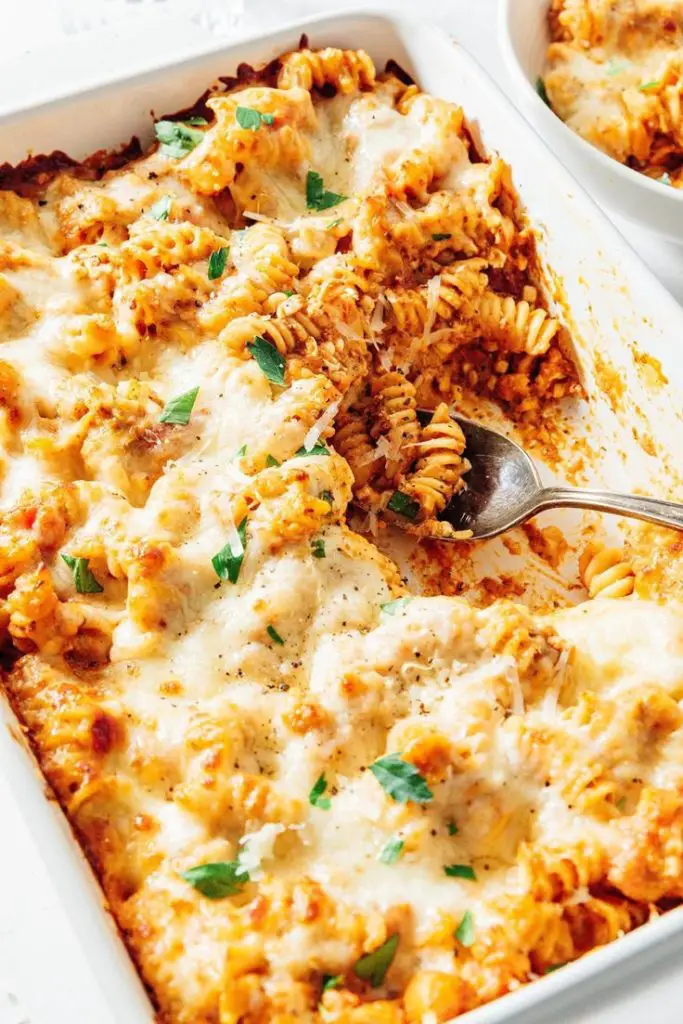 Since some parts of the country are getting snow, wind, and storms, I think a comforting rotini casserole is appropriate. Rotini with sausage and a layer of creamy ricotta is the perfect dish for a winter day. If you’re in warmer climates, don’t worry: you will still be happy with this!