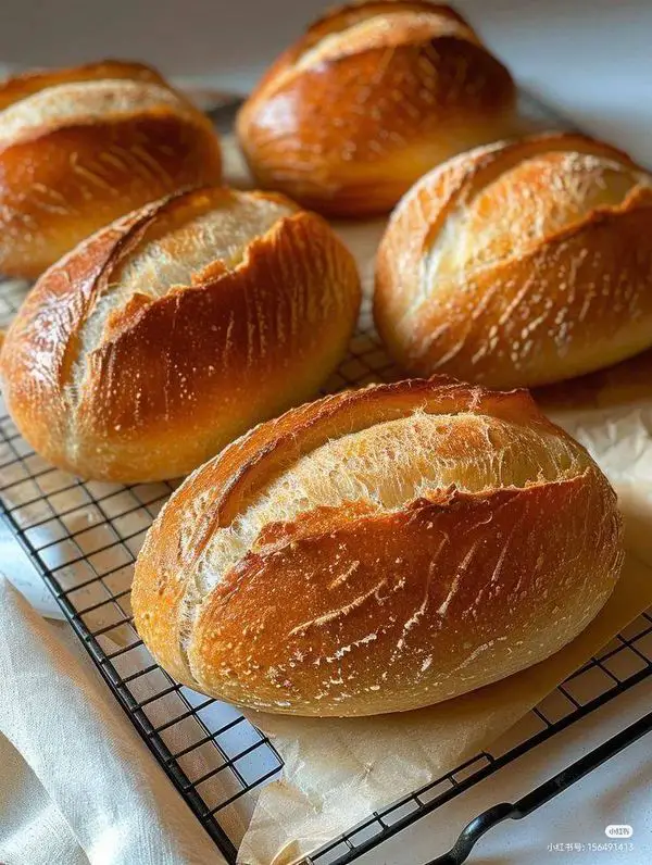 – Once the dough has risen, place the loaves in the preheated oven. Bake for 20-30 minutes until the bread is a deep golden color on the top and bottom. If using an instant-read thermometer, the center of the bread should read 200°F once baked. Remove the loaves from the oven and cool for 30 minutes before slicing.