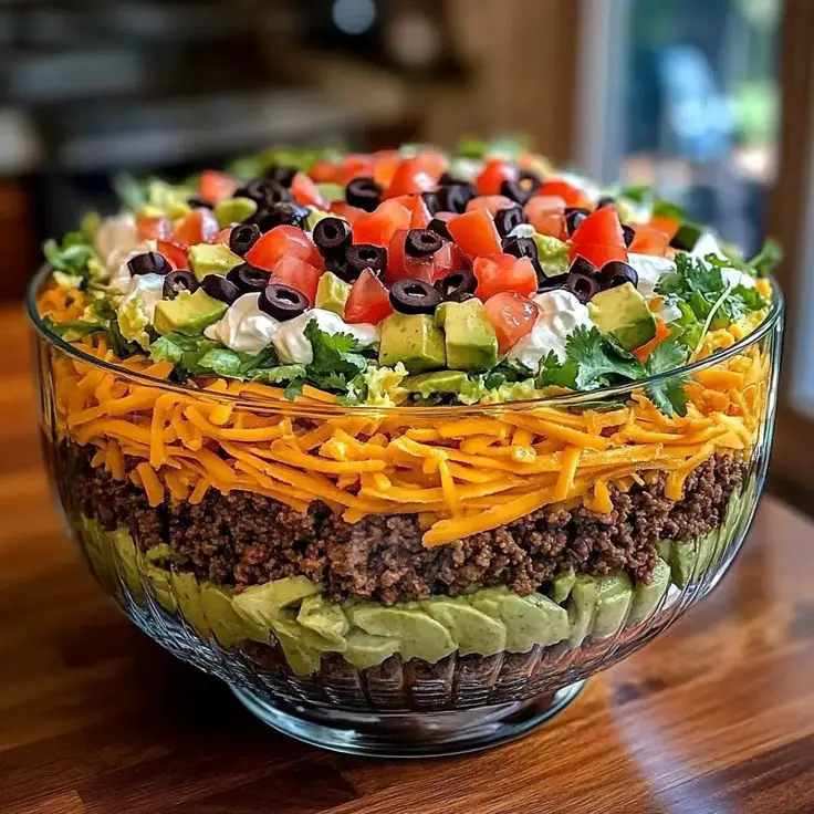 Top layer: Tomatoes, olives, avocado, cilantro, and lettuce