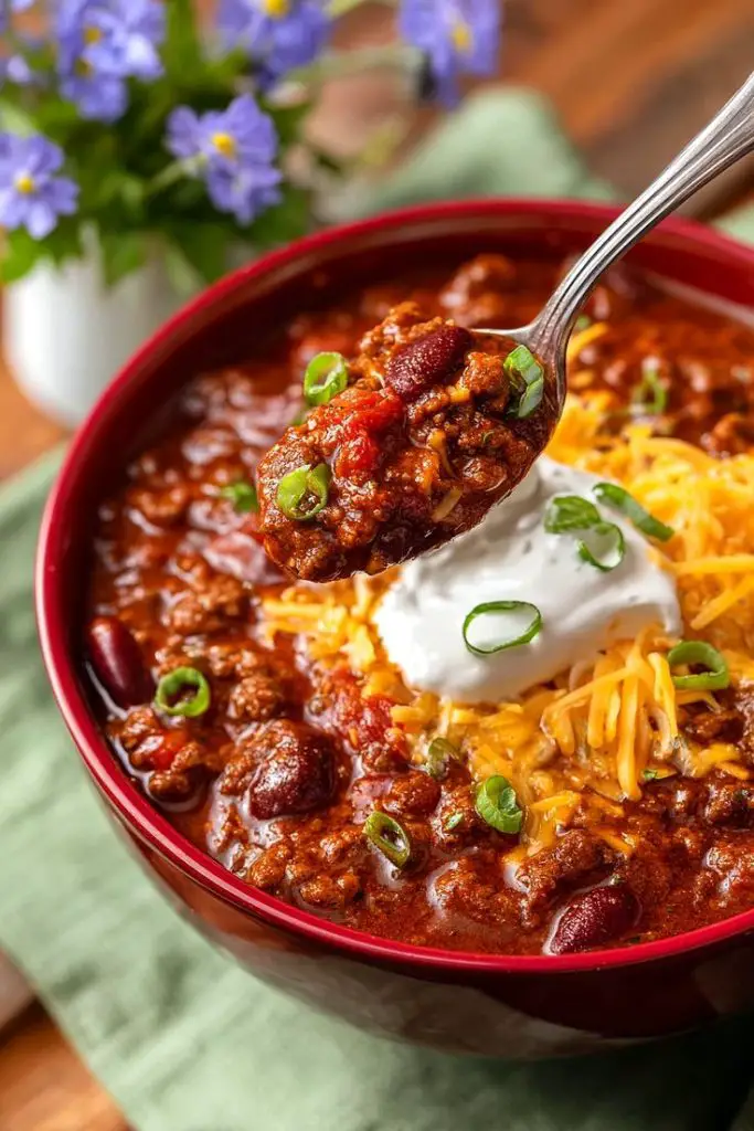 Remove the cover after 1 hour to reduce the liquid and create a thick chili. Add the reserved browned bacon and serve with your favorite toppings.