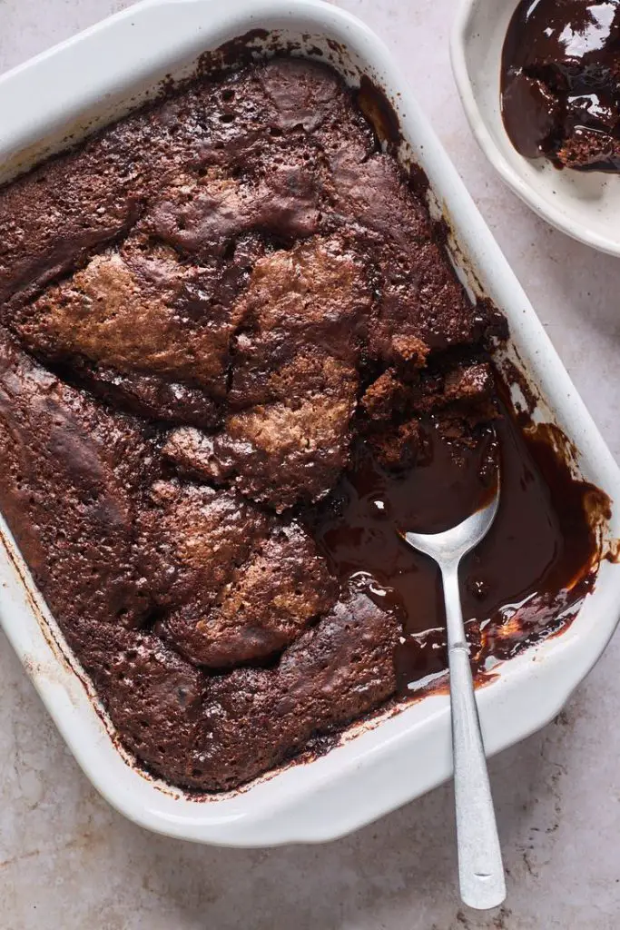 – Place the baking dish in the preheated oven until the cake is puffed and set on top but jiggly around the edges and underneath the cake layer, 25-35 minutes. Once baked, remove the cake from the oven and cool for 15 minutes before serving.