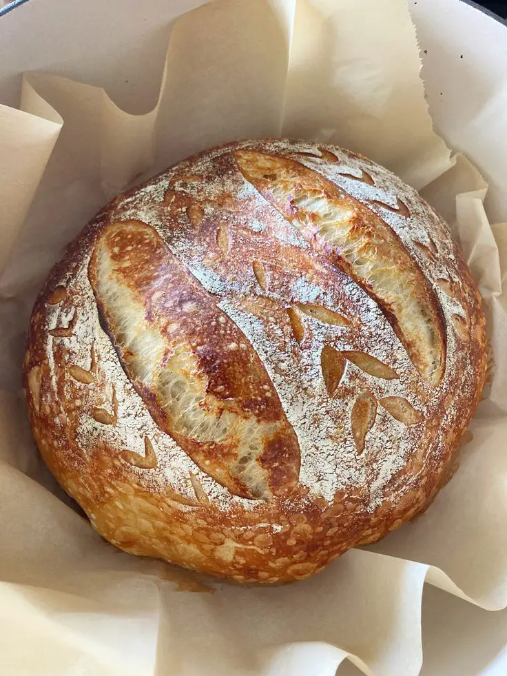 – Turn out the bread onto a piece of parchment paper. Make a 1/2-inch deep half-moon cut in the top of the bread and carefully use the parchment to set the bread into the hot Dutch oven. Add 4 ice cubes to the Dutch oven and cover with the lid.