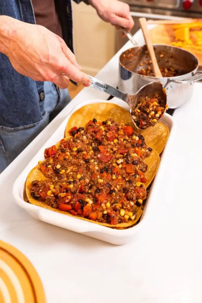 – Spread one cup of the meat mixture on the bottom of the prepared baking dish. It will be a thin layer. Add six corn tortillas, overlapping and going up the sides of the baking dish slightly.