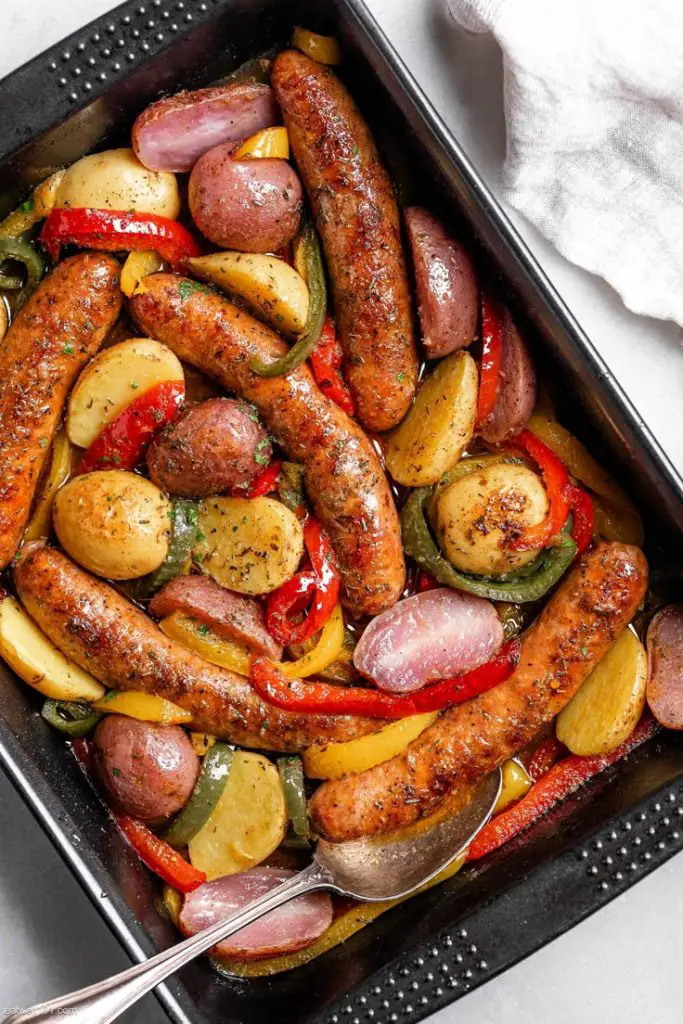 – Add the seared kielbasa to the dish and return to the oven. Roast until the kielbasa is hot and the potatoes are tender, 10-15 minutes. Remove from the oven and serve.