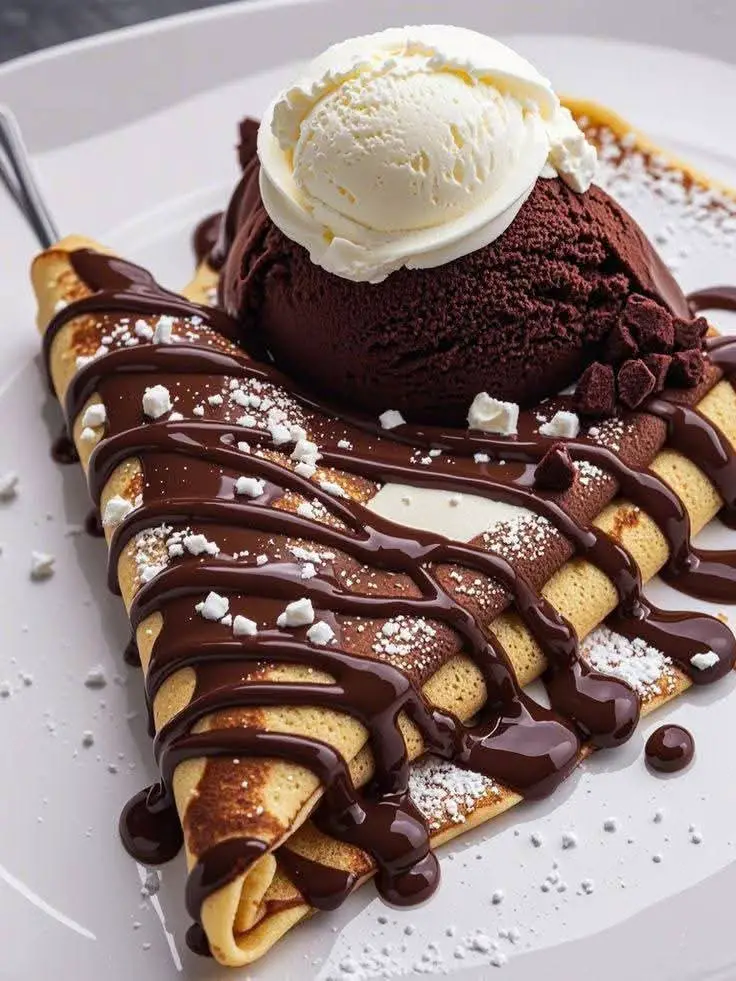 Chocolate Crepes with Vanilla Ice Cream & Brownie
